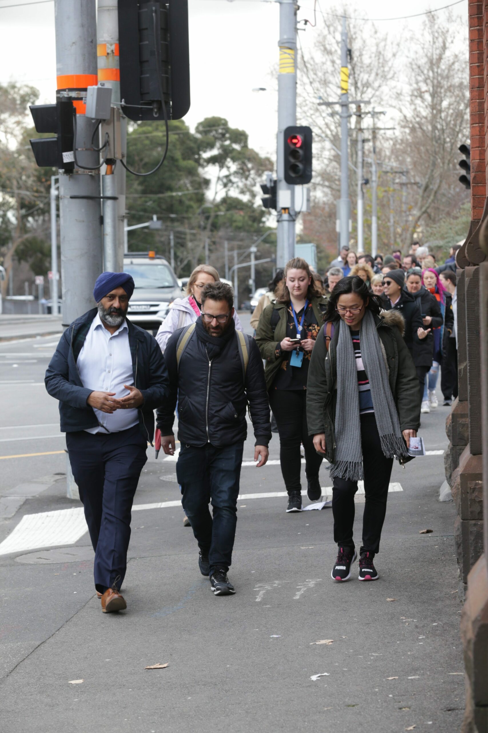 We started the walk at the Victorian Aboriginal Health Service (VAHS) in Fitzroy, hearing from former CEO Alan Brown and Preventative Health Manager Lionel Austin. Both spoke about why Aboriginal and Torres Strait Islander people need culturally safe health services and how they are trying to move towards a good health model, not an illness model.