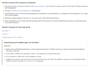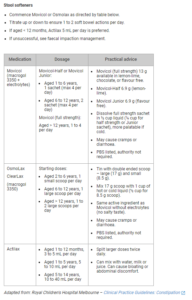 The GP confidently prescribes Tara stool softeners using the information provided in the pathway (stool softener drop down, image below) and advises Sara how to wean the medication down to a medication dose until Tara has soft bowel actions and is a ‘happy pooer’.