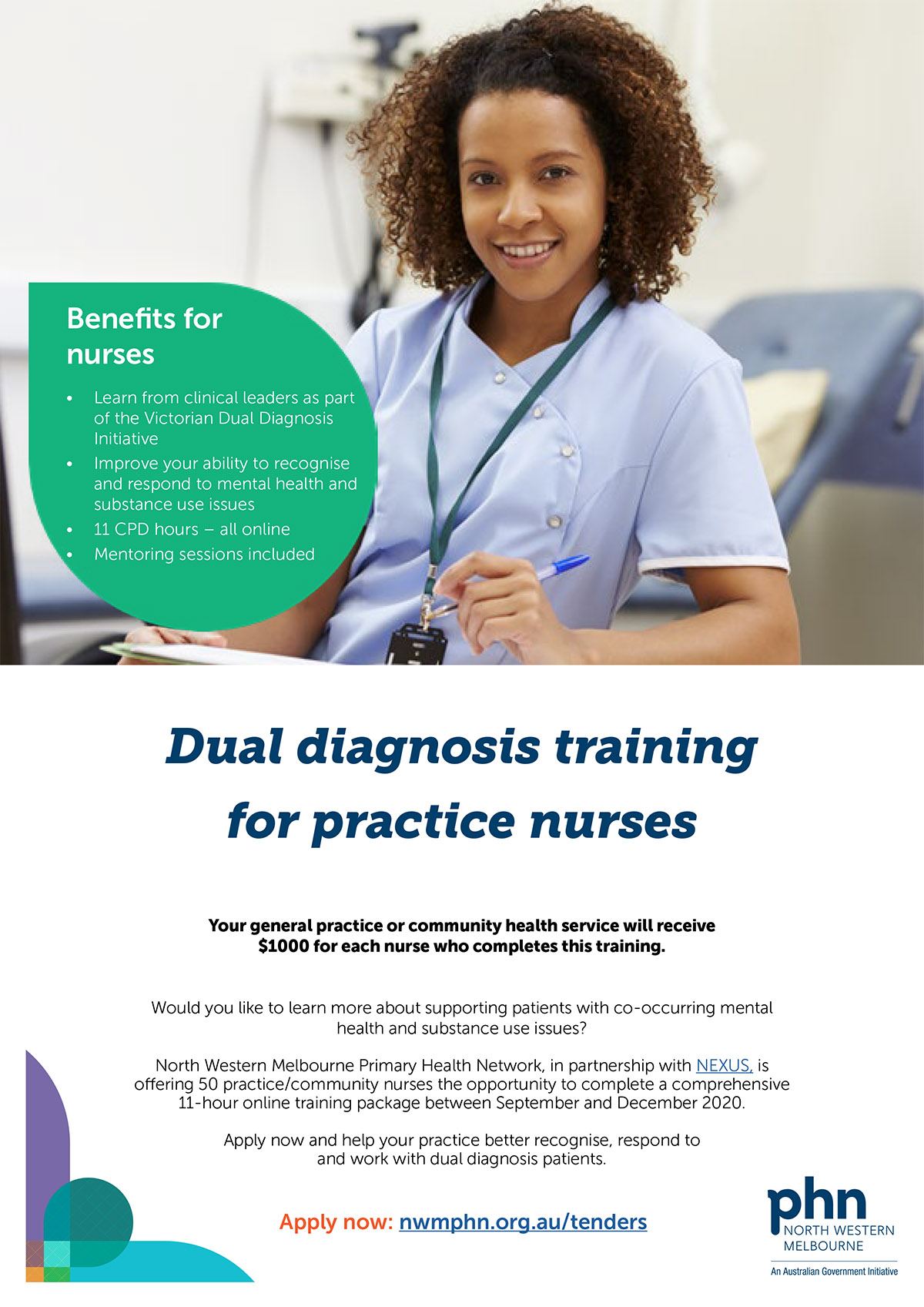 North Western Melbourne Primary Health Network (NWMPHN) and NEXUS (part of the Victorian Dual Diagnosis Initiative), have come together to deliver an exciting training package for nurses in primary care. The project will equip practice nurses with the skills to better recognise, respond to and have confidence working more effectively with clients who present with co-occurring mental health and substance use issues (dual diagnosis).
