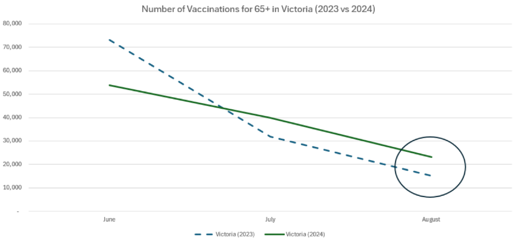 However, in this case the numbers are telling. In Victoria in 2023 there was a steep seasonal decline in COVID-19 vaccinations administered from June to August. In 2024, the decline was not only shallower, but resulted in vaccination numbers exceeding those of the previous year by a solid 16,000.
