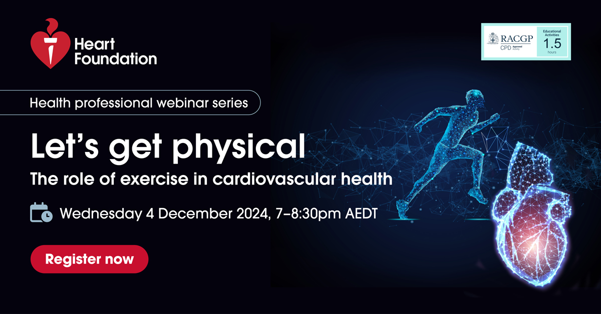‘Let’s get physical: the role of exercise in cardiovascular health’ takes place on Wednesday, 4 December 2024, 7pm – 8:30pm (AEDT).