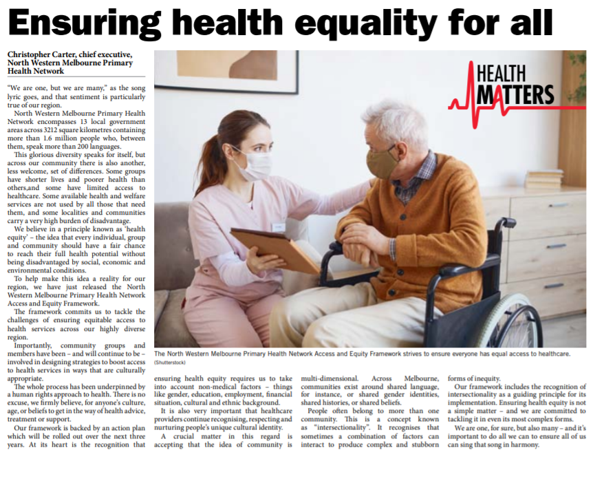To help make this idea a reality for our region, we have just released the North Western Melbourne Primary Health Network Access and Equity Framework.