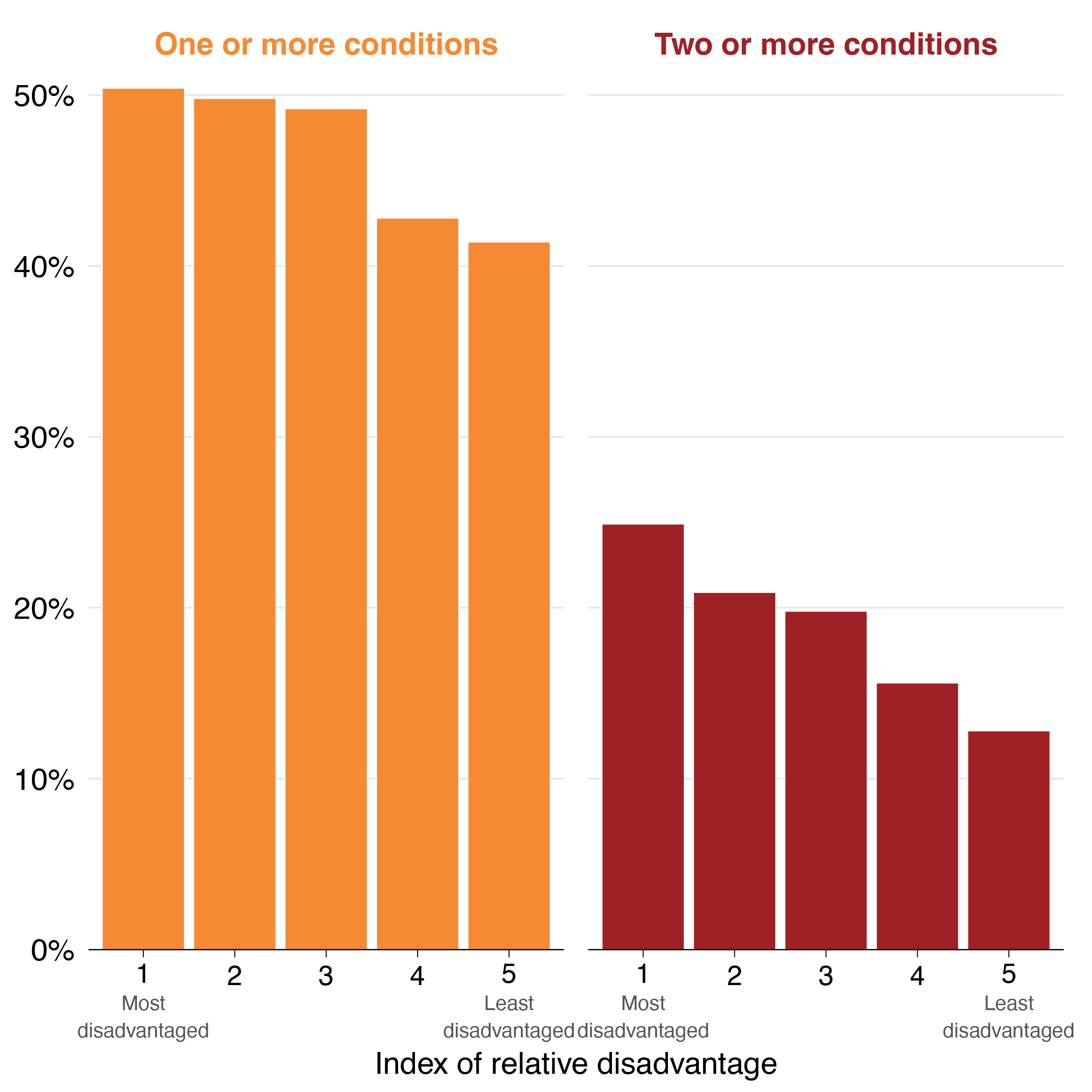 Figure 1: Disadvantaged Australians have higher rates of chronic disease. Rates of chronic disease prevalence by index of socioeconomic disadvantage (click to enlarge). Source: Grattan Institute, published under Creative Commons license.