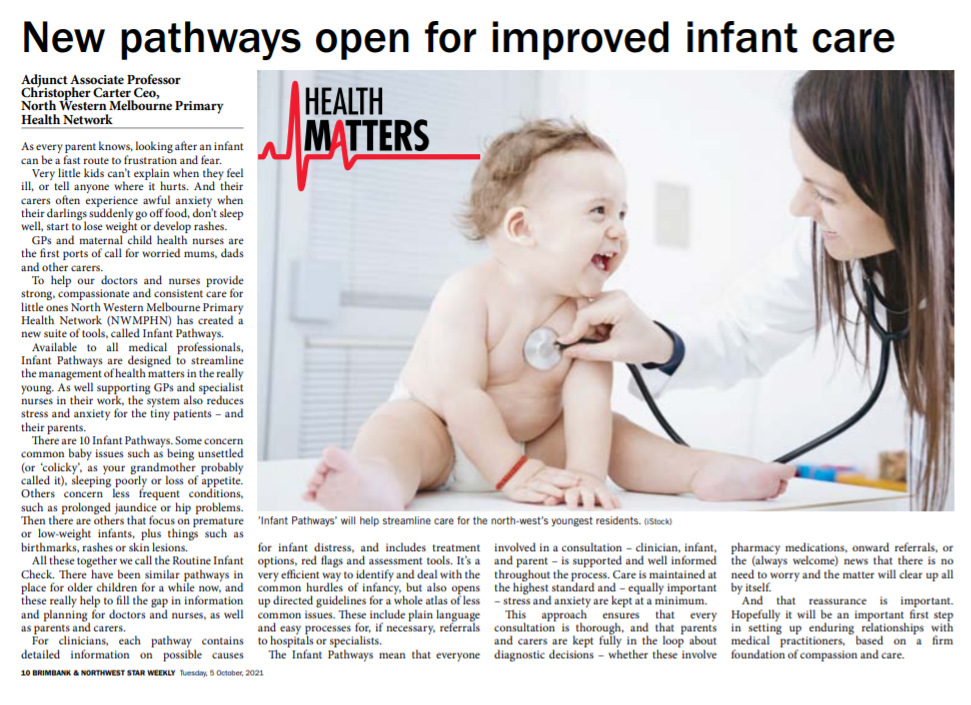 To help our doctors and nurses provide strong, compassionate and consistent care for little ones North Western Melbourne Primary Health Network (NWMPHN) has created a new suite of tools, called Infant Pathways.