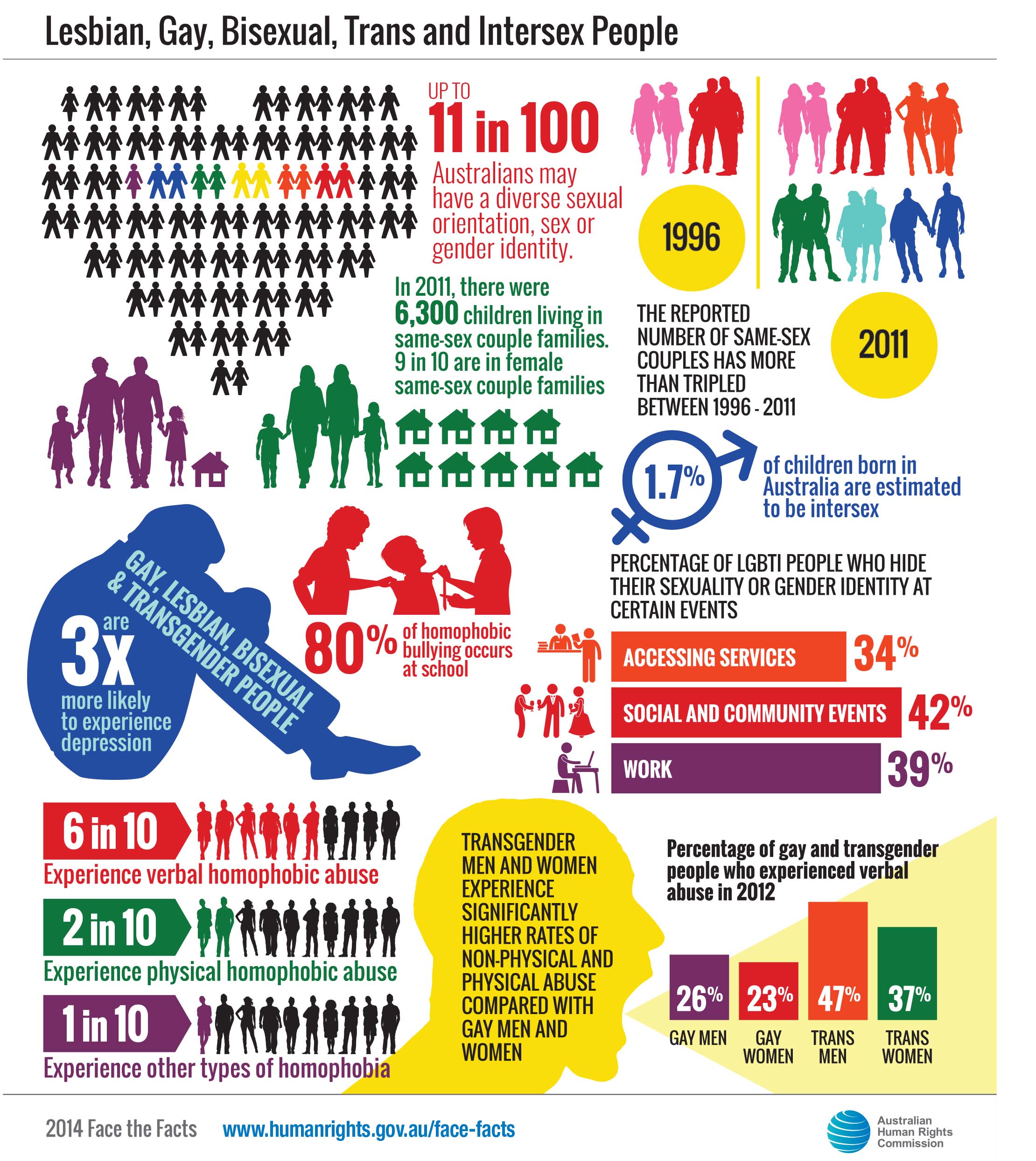 Approximately two per cent of Australian adults identify as lesbian, gay or bisexual. A further six to eight per cent report lifetime same-sex behaviour, and seven to fifteen per cent report same-sex attraction (source). There is a paucity of studies on rates of gender dysphoria and intersex prevalence but is estimated to be one per cent of the population for both (source 1 and 2).