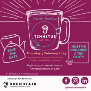 Gather the team and save Thursday, 9 February 2023 in your wellbeing calendars and be part of the Tea For Tinnitus fundraiser for Tinnitus Australia.