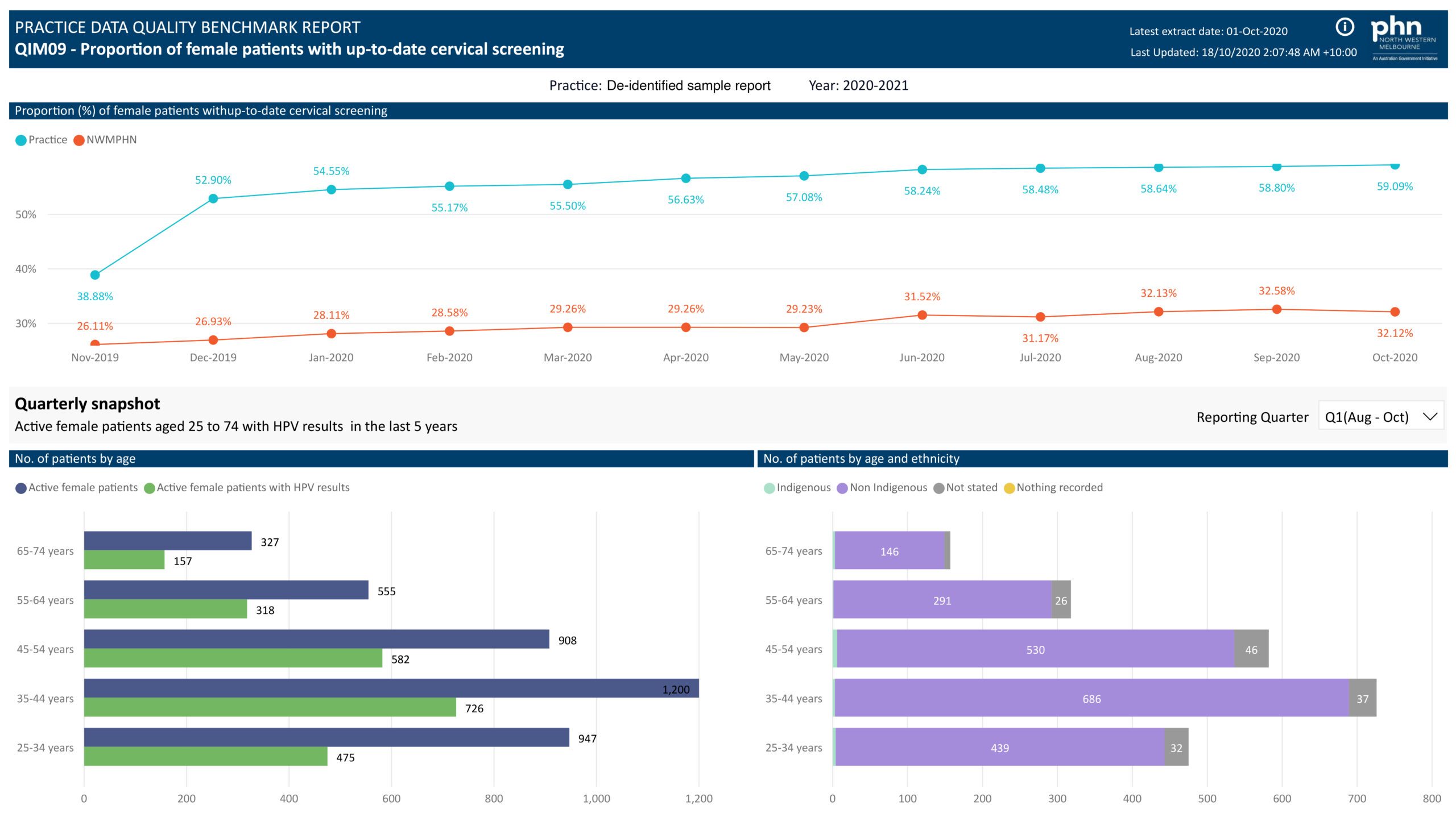 This section of the report shows the percentage of female patients with up to date cervical screening both in your practice and compared to the average across the North Western Melbourne Primary Health Network region (NWMPHN).