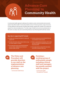 Representatives from general practices, aged care, hospitals, district nursing, community health and medical deputising/locum services worked closely with North Western Melbourne Primary Health Network to systematically implement advance care planning in each organisation as well as across all of the partners involved. This resource draws on the experience of all participants and the strategies and activities that supported them to implement systems and processes for undertaking advance care planning with clients/patients.