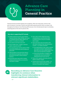 Representatives from general practices, aged care, hospitals, district nursing, community health and medical deputising/locum services worked closely with North Western Melbourne Primary Health Network to systematically implement advance care planning in each organisation as well as across all of the partners involved. This resource draws on the experience of all participants and the strategies and activities that supported them to implement systems and processes for undertaking advance care planning with clients/patients.