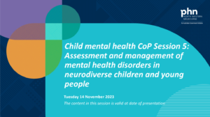 The child mental health community of practice (CoP) is a multidisciplinary CoP for clinicians including but not limited to GPs, practice nurses, psychologists, paediatricians, mental health clinicians, social workers and counsellors.