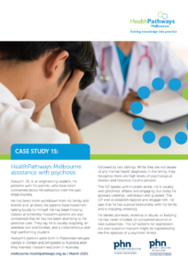 Hussam’s parents were born in Palestinian refugee camps in Jordan and emigrated to Australia after they married. Hussam was born in Australia, followed by two siblings. While they are not aware of any mental health diagnoses in the family, they recognise there are high levels of psychological distress and historical trauma present.