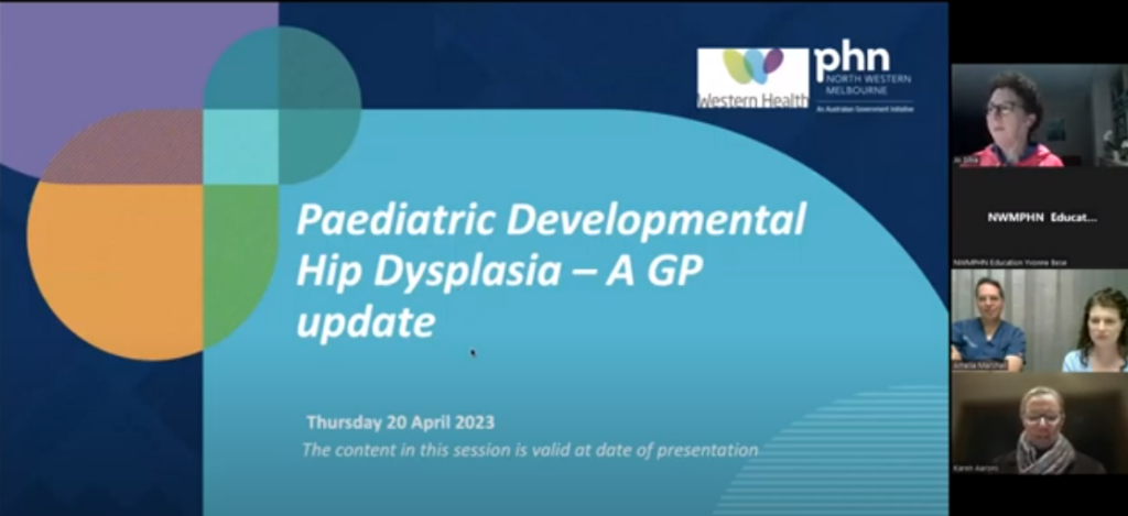 The aim of this session will be to provide education on developmental hip dysplasia (DDH) clinics at Joan Kirner Women’s and Children’s Hospital, Western Health. As well as the advanced practice physiotherapist’s role in the DDH clinics, how DDH is diagnosed, assessed and managed, and referral pathways for GPs.