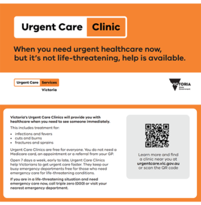This A3 poster is for Urgent Care Clinic (UCC) providers. UCCs are commissioned by primary health networks with funding from the Victorian and Australian governments, and feature orange and black branding.